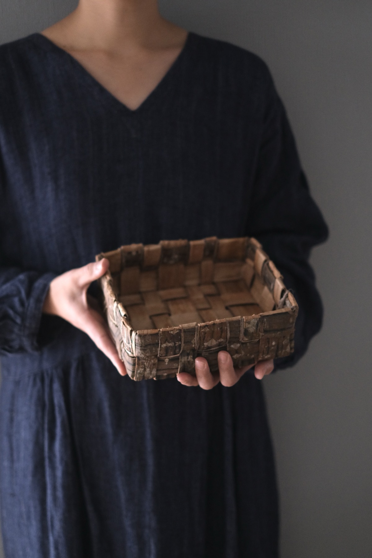 今年アルの森で採取した瓜肌楓の樹皮を用いて編んだ籠